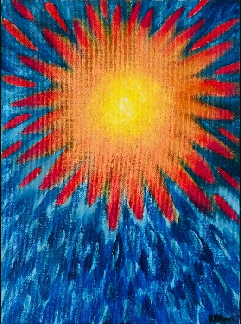 Artist Statement: I wanted to show something that represents living with mental illness but I also wanted to focus on the specs of light instead of the parts that suck. This piece is a representation of the feeling I get after one of my depressive slumps have finally broken, and I get a rush of relief that I can feel happy and content again. Kind of like the feeling of relief, when you are hurt or sick and the pain finally stops.