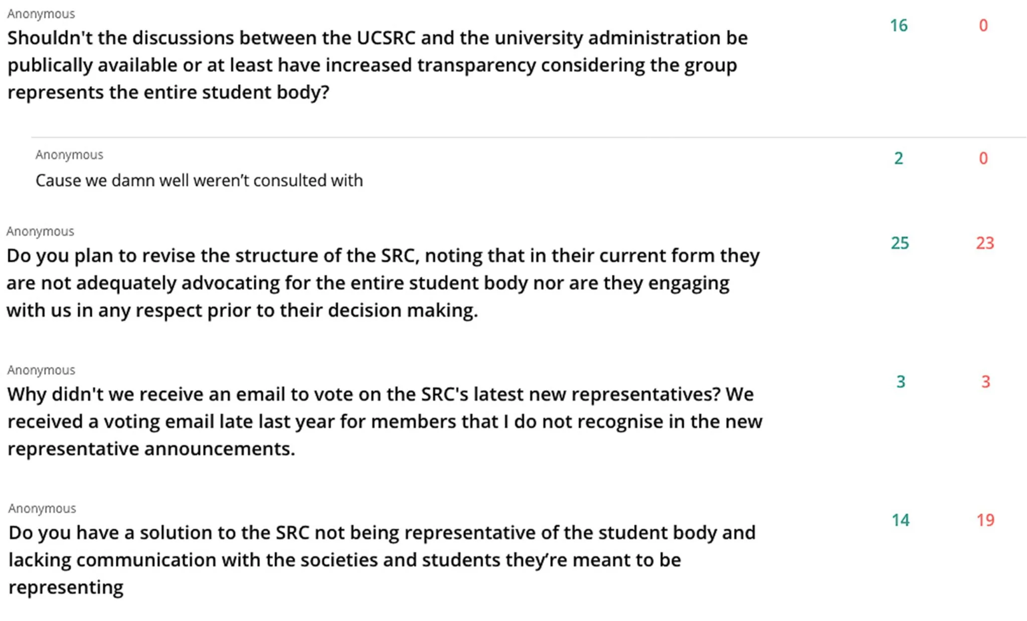 The Semester one Town Hall, held in May, saw multiple students questioning the SRC directly. They called for a restructuring of the SRC and many comments state that the current SRC is not adequately representing the student body.