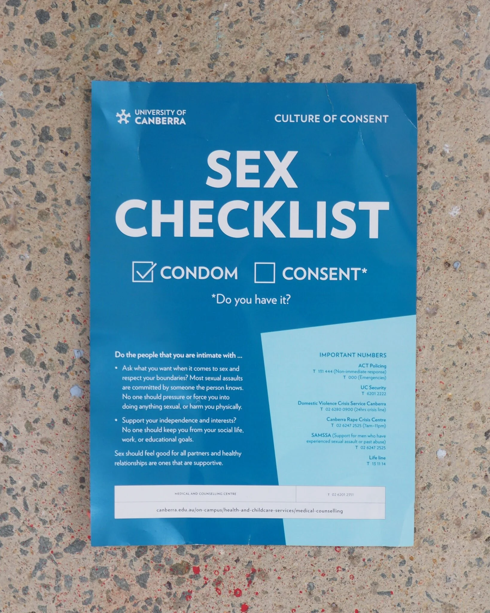 Clearly the standard for what is and is not ‘too triggering’ does not apply to other posters around campus. Specifically, the ones found in some bathrooms, which so cavalierly imply that consent is a checkbox item, something you tick off at the start of an interaction, as opposed to an ongoing conversation. And, to make matters worse, they have placed consent next to something that is entirely optional, the use of a condom. The implications of this, whether intentional or not, are incredibly harmful and dangerous.
